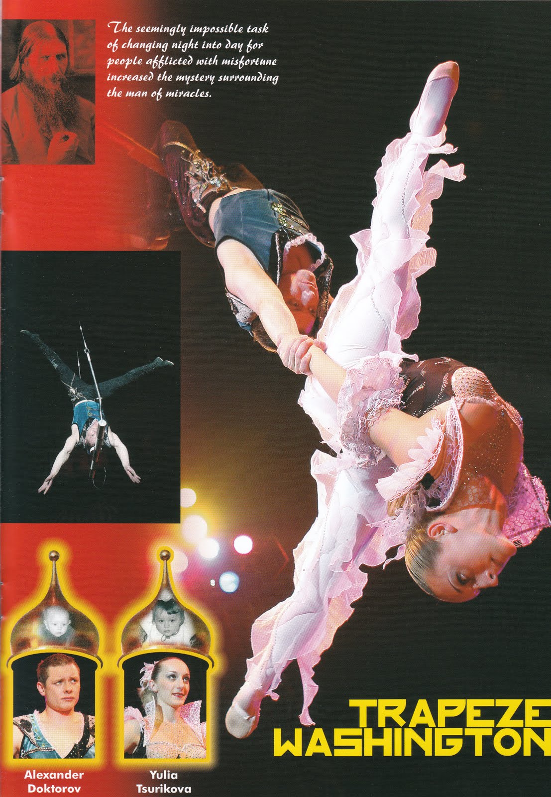 So it was off to the circus for this little black duck yesterday – the Moscow State Circus at the Old Deer Park in Richmond to be exact – so me ‘n’ J set off to catch the matinee performance with our 50% off vouchers expecting a jolly afternoon of old-fashioned family-style entertainment. And…well…wow! We loved it! The theme was the story of Rasputin (you know, Ra-ra-rasputin, lover of the Russian Queen for all you Boney M fans) and while that side of things didn’t really grab me, the performers absolutely did. What amazing discipline and precision…even the mad man who ran around the OUTSIDE of the sky wheel WITH A BLINDFOLD ON completely impressed me despite the rising tide of fear in my belly while watching this one. But I’ve included pics of my faves for you (scanned from the £3 program) and at £7.50 for each ticket, that’s excellent value for a pretty awesome afternoon’s entertainment!